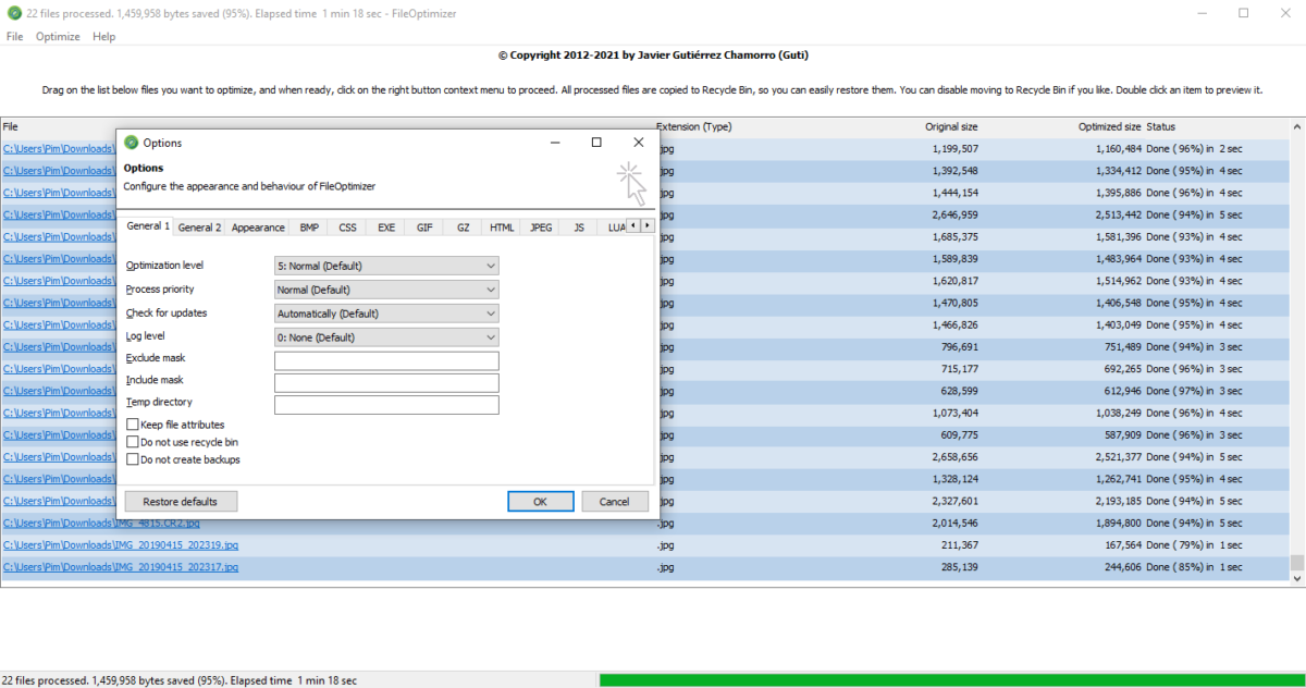 FileOptimizer is a lossless file size optimiser supporting .3G2, .3GG, .3GP, .7Z, .A, .AAI, .AC, .ACC, .ADP, .AI, .AIR, .APK, .APNG, .APPX, .APR, .ART, .ART, .AVI, .AVS, .BAR, .BMP, .BPG, .BPL, .BSZ, .CBT, .CBZ, .CDR, .CDT, .CHI, .CHM, .CHQ, .CHS, .CHW, .CIN, .CMYK, .CMYKA, .CPL, .CSL, .CSS, .CUR, .DB, .DB, .DCX, .DDS, .DEB, .DES, .DIB, .DLL, .DOC, .DOCM, .DOCX, .DOT, .DOTM, .DOTX, .DPX, .DRV, .DWF, .DWFX, .EAR, .EASM, .EML, .EMLX, .EPDF, .EPDF, .EPRT, .EPUB, .EXE, .FAX, .FAX, .FB2, .FDF, .FITS, .FLA, .FLAC, .FLV, .FPX, .FPX, .FXG, .FXG, .GALLERY, .GALLERYCOLLECTION, .GALLERYITEM, .GFT, .GIF, .GRAY, .GRS, .GZ, .HDR, .HRZ, .HTM, .HTML, .ICB, .ICL, .ICO, .ICO, .INK, .INLINE, .IPA, .IPK, .IPSW, .ITA, .ITS, .ITZ, .J2C, .J2K, .JAR, .JFI, .JFIF, .JIF, .JNG, .JP2, .JPC, .JPE, .JPEG, .JPG, .JPS, .JPT, .JS, .JSON, .KML, .KMZ, .KMZ, .KSF, .LIB, .LIT, .LUA, .LUAC, .LXF, .LZL, .LZMA, .M4A, .M4B, .M4P, .M4R, .M4V, .MAX, .MBX, .MCE, .MDB, .MDT, .MDZ, .MHT, .MHT, .MHTML, .MHTML, .MIC, .MIF, .MIFF, .MIX, .MIZ, .MK3D, .MKA, .MKS, .MKV, .MMIP, .MNG, .MONO, .MOV, .MP3, .MP4, .MPC, .MPD, .MPEG, .MPG, .MPO, .MPP, .MPP, .MPR, .MPT, .MSC, .MSG, .MSG, .MSI, .MSL, .MSP, .MST, .MSZ, .MTV, .MTW, .MVG, .MVZ, .MZZ, .NAR, .NBK, .NOTEBOOK, .O, .OBJ, .OCX, .ODB, .ODF, .ODG, .ODP, .ODS, .ODT, .OEX, .OGA, .OGG, .OGG, .OGV, .OGX, .OGX, .OLE, .OLE2, .ONE, .OPT, .ORA, .OSK, .OST, .OTB, .OXPS, .P7, .PALM, .PBM, .PCC, .PCD, .PCDS, .PCL, .PCLS, .PCX, .PDB, .PDF, .PFM, .PFS, .PGM, .PIC, .PICON, .PICT, .PK3, .PNG, .PNM, .PNS, .POTM, .POTX, .PPAM, .PPM, .PPS, .PPSM, .PPSX, .PPT, .PPTM, .PPTX, .PSB, .PSD, .PTIF, .PTIF, .PTIFF, .PTIFF, .PUB, .PUB, .PUZ, .QT, .QWK, .R2SKIN, .RA, .RAM, .RDB, .RDB, .RFA, .RFG, .RFT, .RGB, .RGBA, .RLL, .RM, .RMSKIN, .RMVB, .RTE, .RV, .RVT, .S3Z, .SCR, .SGI, .SGML, .SLDASM, .SLDDRW, .SLDM, .SLDPRT, .SLDX, .SMIL, .SOU, .SPL, .SPO, .SQLITE, .SQLITE2, .SQLITE3, .STZ, .SUN, .SVG, .SVGZ, .SWC, .SWF, .SYS, .TAR, .TGA, .TGZ, .THM, .TIF, .TIFF, .UYVY, .VBX, .VCARD, .VCF, .VDA, .VDX, .VICAR, .VIFF, .VLT, .VOB, .VSD, .VSS, .VST, .VST, .VSX, .VTX, .WAL, .WAR, .WAV, .WBA, .WBMP, .WEBA, .WEBM, .WEBP, .WIZ, .WMA, .WMV, .WMZ, .WPS, .WSZ, .X, .XAP, .XBM, .XHTML, .XHTML, .XL, .XLA, .XLAM, .XLC, .XLM, .XLS, .XLSB, .XLSM, .XLSX, .XLTM, .XLTX, .XLW, .XML, .XML, .XMZ, .XNK, .XPI, .XPM, .XPS, .XSF, .XSL, .XSLT, .XSN, .XWD, .YCBR, .YCBRA, .YUB, .Z01, .Z02, .Z03, .Z04, .Z05, .Z06, .Z07, .Z08, .Z09, .Z10, .ZIP, .ZIPX, .ZX01, .ZX02, .ZX03, .ZX04, .ZX05, .ZX05, .ZX06, .ZX07, .ZX08, .ZX09, .ZX10, STICKYNOTES.SNT and THUMBS.DB file formats among many others.