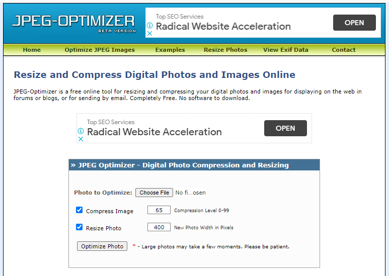 The first tool on the list is JPEG Optimizer. This tool lets you compress images online, and it is a simple tool that works as it should. The best thing about this tool is that it lets you resize images before you optimise, which will save you a lot of loading time. Plus, it lets you select your own optimization levels and control the image quality, which is a vital feature if you want to hit the sweet spot between saving space and preserving quality.