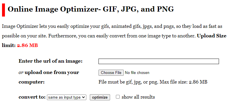 Online Image Optimizer is an image compression app developed by Dynamic Drive, and it lets you optimise your images in all major image types with ease. It can also help you turn your JPEG images into PNG files. Plus, you can upload images here using URL, so you can optimise images that are already on your website without having to waste time downloading them and uploading them for the process. The only downside is that you can only upload one image at a time with a maximum file size of 2.86 MB, which can significantly limit this tool’s scope of use, especially if you use PNG files.